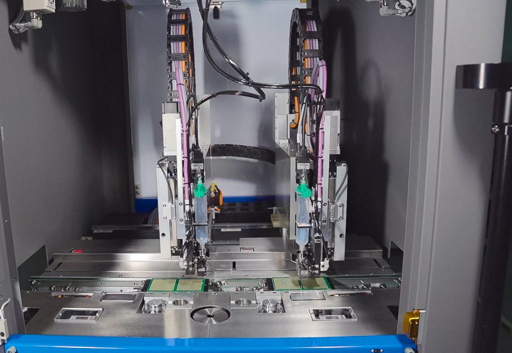 Ability to handle 2 different tasks simultaneously with its dual, fully independent dual gantry motion platform. It adopts two different micro-dispensing heads and with six independent axis-controlled gantry configurations on a separate XYZ axis.